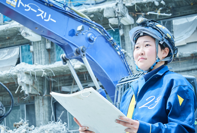 「1」が「0」になるスタート地点を創る工事を全て管理する、現場管理。解体が理論と計画で進む面白さに惹かれて入社。現場管理として経験を重ねながら、さまざまな現場を任される存在を目指して日々成長中です。